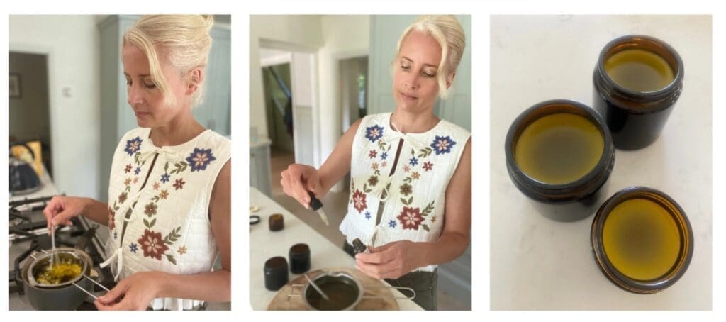 I then combined with coconut oil and beeswax in a double boiler to form a balm. I added peppermint, lavender & frankincense essential oils for their anti-inflammatory & pain-relieving properties.